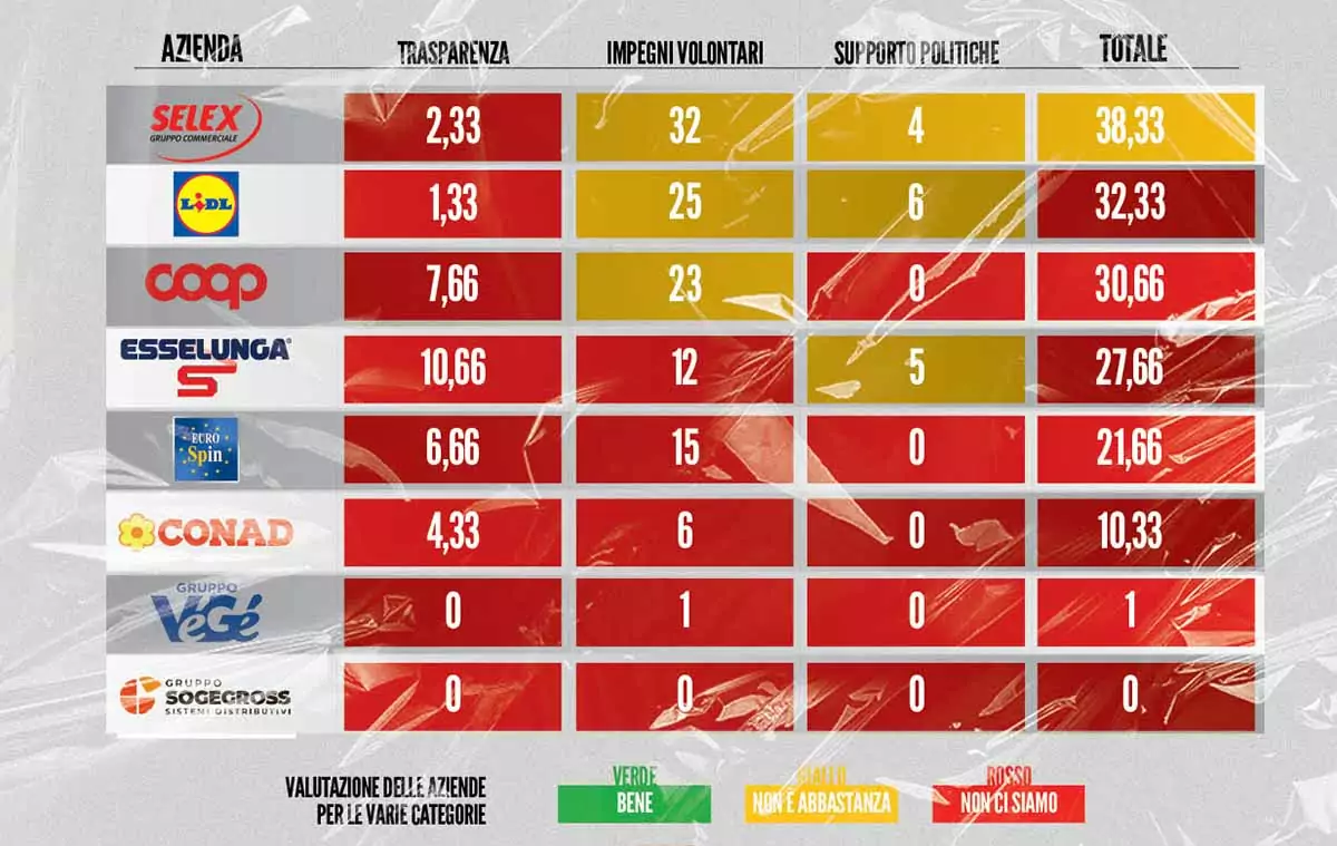 Di tutte le aziende valutate soltanto Selex ha ottenuto complessivamente una risicata sufficienza, grazie agli impegni per ridurre la quantità di plastica utilizzata (del 30% entro il 2025) e la volontà di incrementare la vendita di prodotti sfusi o con sistema di ricarica entro il 2025. Viceversa, le altre insegne di supermercati, pur avendo già avviato iniziative per diminuire l’impiego di plastica (in termini di peso) per alcuni imballaggi e incrementare l’uso di materiale riciclato, mancano di una strategia coerente basata su obiettivi ambiziosi e a lungo termine, soprattutto sul riuso. I punteggi più bassi sono stati fatti registrare dal Gruppo Végé (Bennet, Multicedi, Moderna, GDA, ISA, etc) e Sogegross (Basko, Ekom, Doro, etc) che, oltre a non aver risposto al questionario, mettono a disposizione scarse informazioni sui propri siti web. Conad, il più grande gruppo operante in Italia, non solo non ha risposto al questionario ma si è classificata agli ultimi posti, con 10,33 punti sui 100 disponibili.