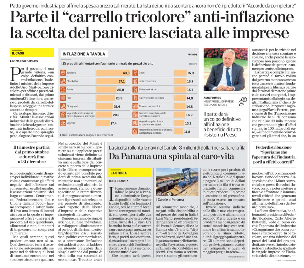 Sotto su La Stampa del 9 settembre 2023 : il paniere verrà deciso da ogni singola impresa. Questa impostazione sembra confermare che in Italia succederà poco o nulla, come in Francia. E c’è chi parla , giustamente, secondo noi, di “teatrino del Ministro e del comparto alimentare”.