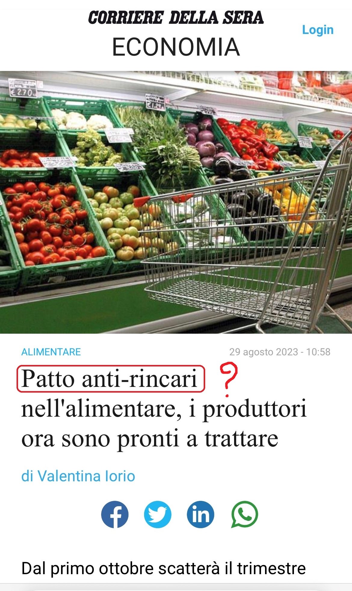 Sotto un titolo del Corriere del 29 settembre 2023 (con data sbagliata sullo screenshot ma il link fa capire che l’articolo è di oggi) : si tratta di un errore marchiano , non c’è nessun “patto anti- rincari”.