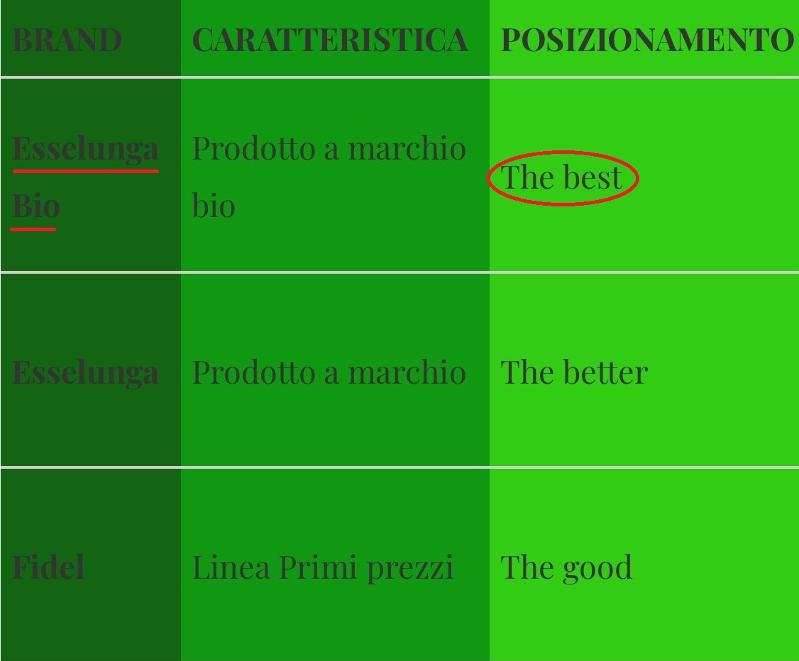 Sotto, in fondo, trovate la mia idea : Esselunga Bio doveva essere il prodotto migliore (n.b. : Fidel era il marchio di primo prezzo di Esselunga, all’epoca).