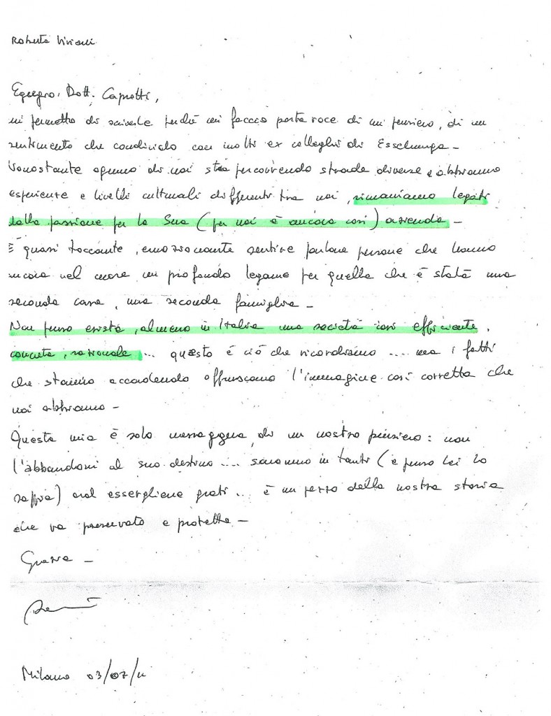 … mi faccio portavoce di un pensiero, di un sentimento che condivido con molti ex colleghi di Esselunga. Nonostante ognuno di noi stia percorrendo strade diverse…, rimaniamo legati dalla passione per la sua (per noi è ancora così) azienda…non l’abbandoni al suo destino… saranno in tanti (e penso lei lo sappia) ad essergliene grati…è un pezzo della nostra storia che và preservato e protetto Milano il 3/07/2011