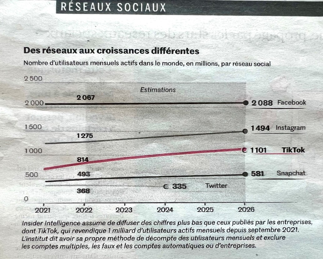Sotto : il numero di utilizzatori mensili attivi nel mondo secondo Insider Intelligence che dice : di avere il proprio metodo di calcolo, di escludere gli account doppi, i falsi, gli account automatici o d’impresa.