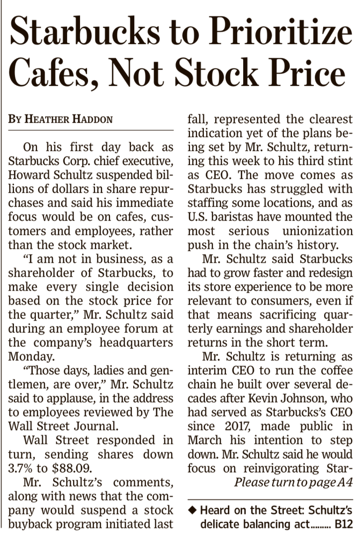 Sotto : Schultz, il 5 aprile 2022, ha annunciato che rimetterà il caffè “al centro” del business. Purtroppo l’annullamento del buyback delle sue azioni ha causato la caduta del titolo che non si è ancora ripreso (Repubblica 11 aprile 2022).
