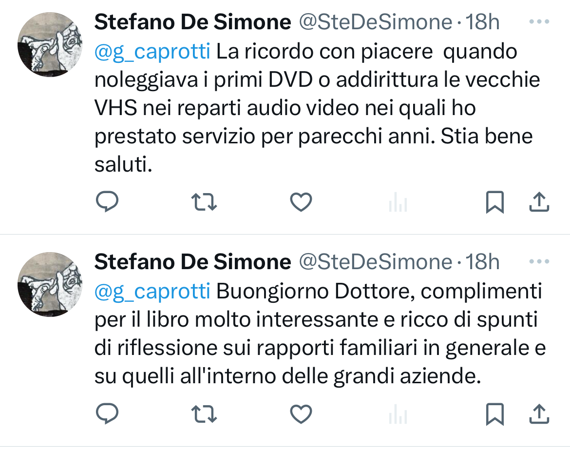La ricordo con piacere quando noleggiava i primi DVD o addirittura le vecchie VHS nei reparti audio video [il servizio venne inserito nei superstore, seguendo il modello americano dell’epoca] nei quali ho prestato servizio per parecchi anni. Stia bene saluti