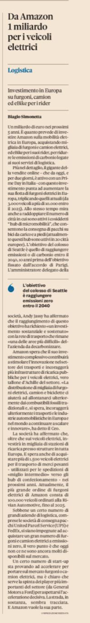 Più nel dettaglio, il gigante della vendite online – che da oggi, e per due giorni, è attivo con un Prime Day in Italia – con questo investimento punta ad aumentare la sua flotta di furgoni elettrici in Europa, triplicando quelli attuali (da 3.000 veicoli a più di 10.000 entro il 2025). Allo stesso tempo mira anche a raddoppiare il numero di città in cui sono attivi i cosiddetti “ hub di micromobilità”, che consentono la consegna di pacchi su bici da carico e a piedi (attualmente questi hub sono attivi in 20 città europee). L’obiettivo del colosso di Seattle è quello di raggiungere emissioni 0 di carbonio entro il 2040, 10 anni prima dell’obiettivo fissato dall’accordo di Parigi. L’amministratore delegato della società, Andy Jassy ha affermato che il raggiungimento di questo obiettivo ha richiesto «un investimento sostanziale e sostenuto» con la rete di trasporto che rimane «una delle aree più difficili» dell’azienda da decarbonizzare.