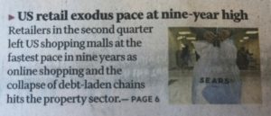 7400 chiusure annunciate, tra le quali quelle delle insegne come Sears e Victoria’s Secret in difficoltà da tempo . Colpiti i centri commerciali di seconda fascia. Principale indiziato: l’e-commerce. Financial Times 22 Luglio 2019