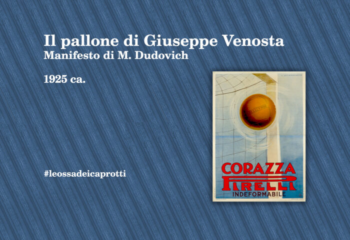 Mio nonno Guido Venosta lavorerà a lungo alla Pirelli, dove suo padre Giuseppe fu Direttore generale nonché inventore del primo moderno pallone da calcio, il “Corazza Pirelli” con l’anima in gomma che avrebbe sostituito i palloni in cuoio usati fino ad allora. Le pubblicità del nuovo pallone, leggero e resistente, furono disegnate anche per mano del celebre Marcello Dudovich, considerato uno dei fondatori del manifesto pubblicitario del ‘900 e uno dei più grandi disegnatori e cartellonisti italiani. Manifesto di M. Dudovich, Corazza Pirelli, Museo Nazionale Collezione Salce, Direzione regionale Musei Veneto, pubblicazione su concessione del Ministero della Cultura.