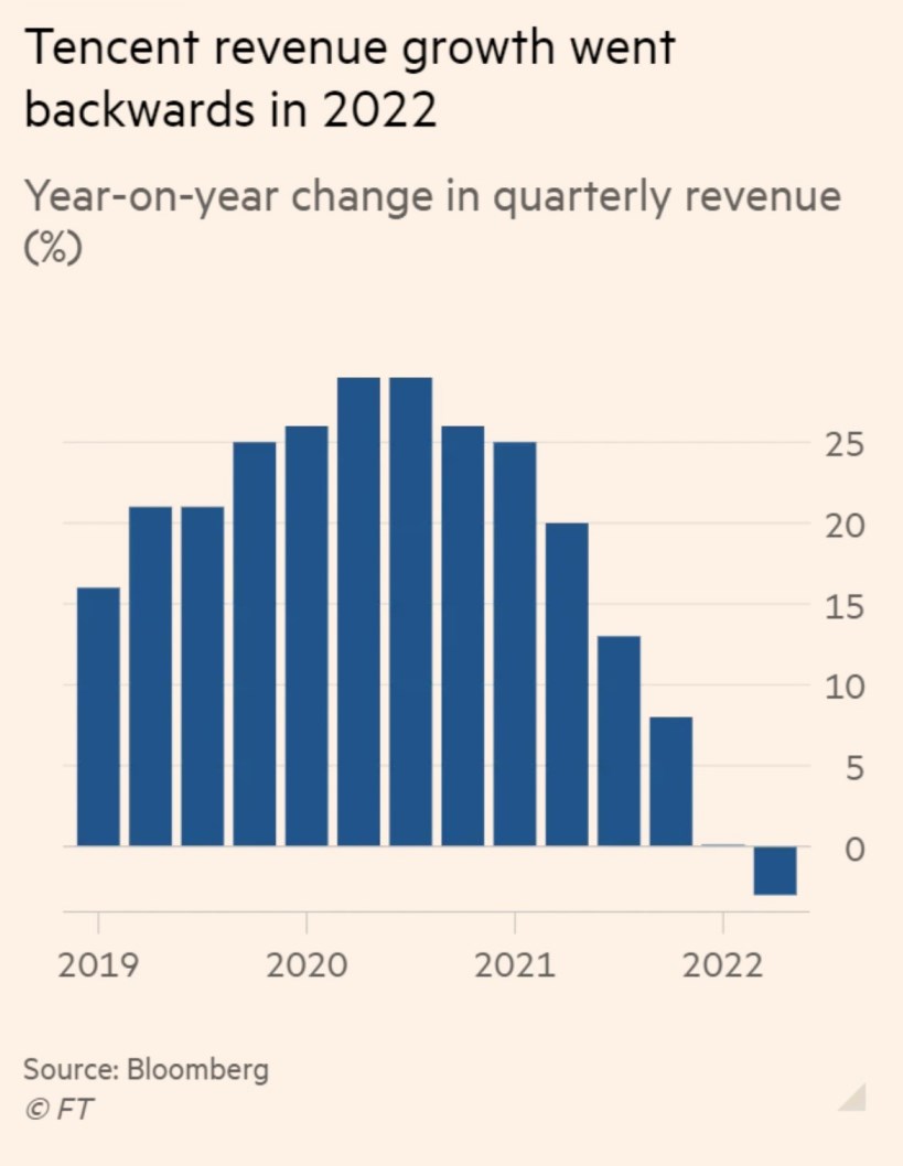 Sotto : il fatturato di Tencent, in discesa, per la prima volta da anni, nel 2022.
