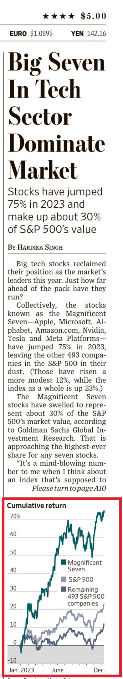 Sotto i titoli delle sette aziende tecnologiche USA (big seven o magnificent seven, barra in verde sotto) hanno messo a segno un + 75% quest’anno (WSJ 18 dicembre 2023).
