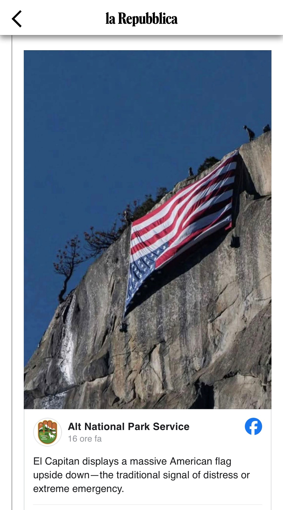 Sotto : Trump licenzia 1000 ranger. La protesta: bandiera capovolta sulla montagna-icona dello Yosemite Park.