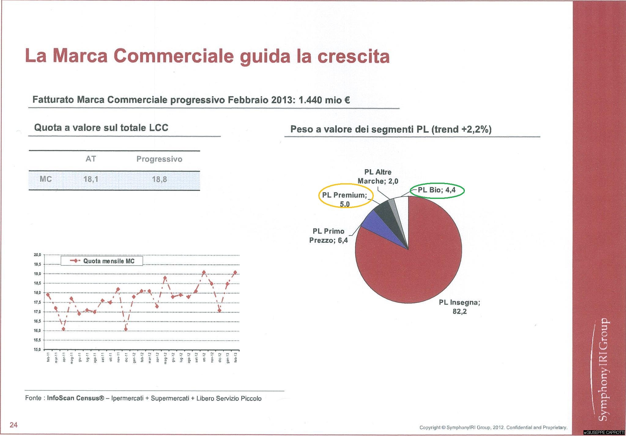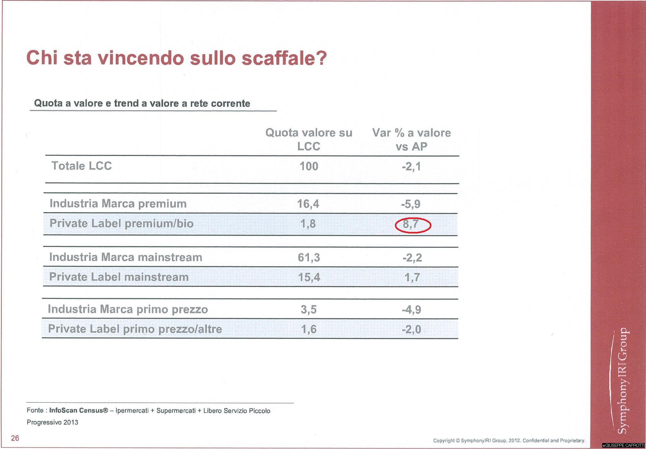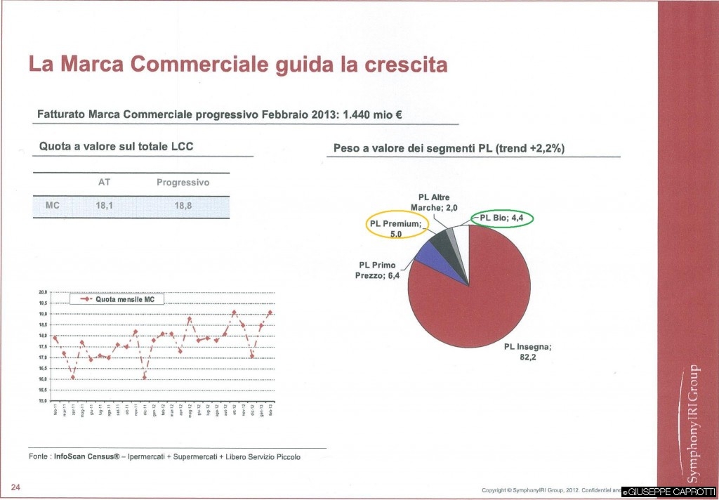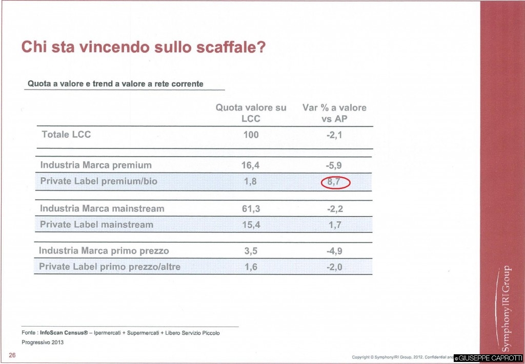Oggi, nel LARGO CONSUMO CONFEZIONATO (LCC), il segmento premium/ bio è quello con la crescita più alta tra le marche private (private label) ma anche tra le MARCHE DELL’INDUSTRIA,