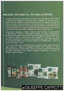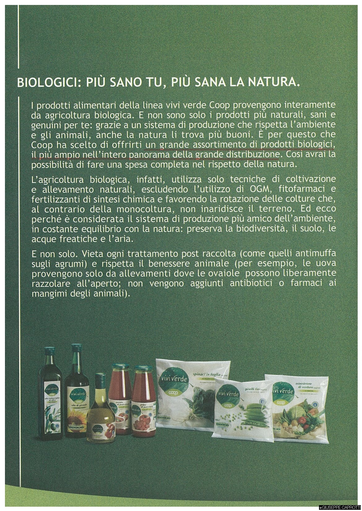 Come non possiamo non segnalare un altro cambiamento di rotta: Coop che aveva varato i suoi prodotti a marchio Coop, i bio- logici li ha cancellati per lanciare la linea Viviverde che ingloba tutte le sue linee ecologiche