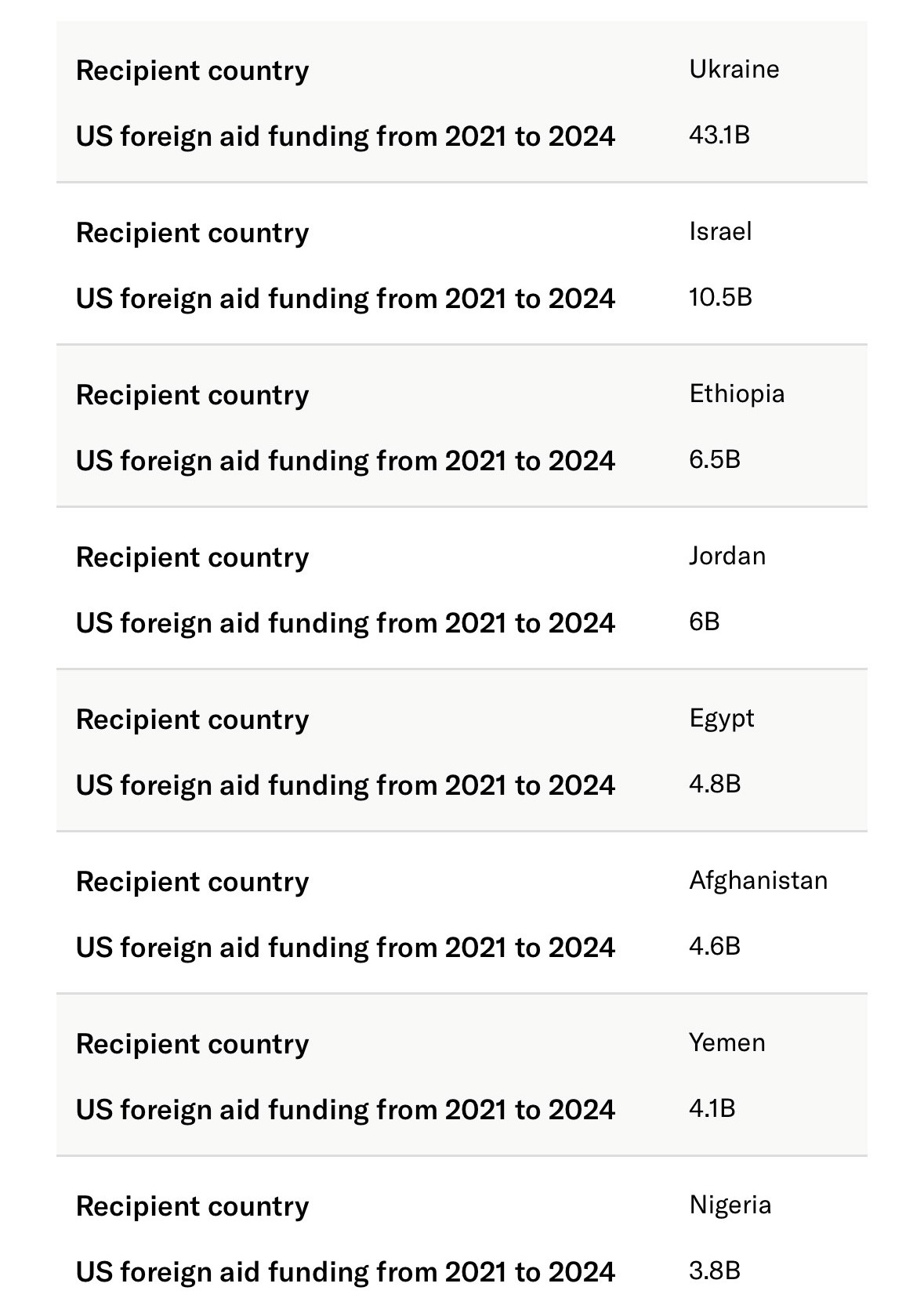 Il Congressional Budget Office ha già previsto quasi 60 miliardi di dollari in aiuti esteri per il 2025, la maggior parte dei quali destinati a progetti USAID. In particolare, hanno beneficiato di questi fondi i Paesi del Medio Oriente, dell’Africa orientale, dell’Asia meridionale e dell’America Latina”.