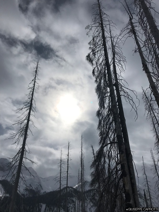 Sotto : foto di foresta canadese bruciata. Sopra, in cover, pioppi ad Albiate.