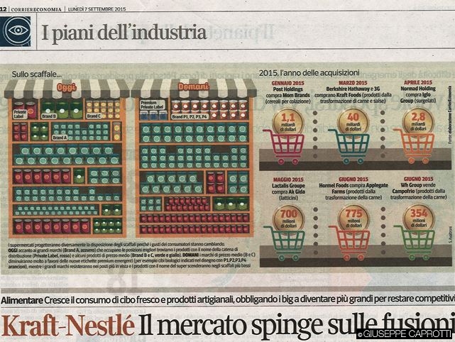 Il Corriere Economia del 7 settembre 2015 evidenzia le tendenze già enunciate mettendo l’accento sulle acquisizioni e le fusioni delle multinazionali del cibo confezionato