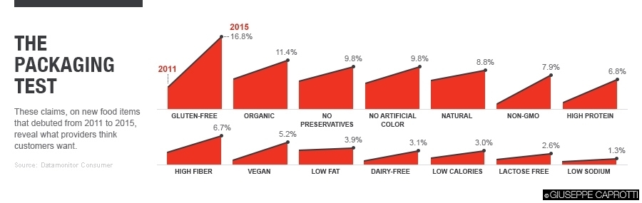 Gli incrementi dei claim (affermazioni) sui nuovi prodotti dal 2011 al 2015: senza glutine e organic ( bio) sono decisamente in testa.
