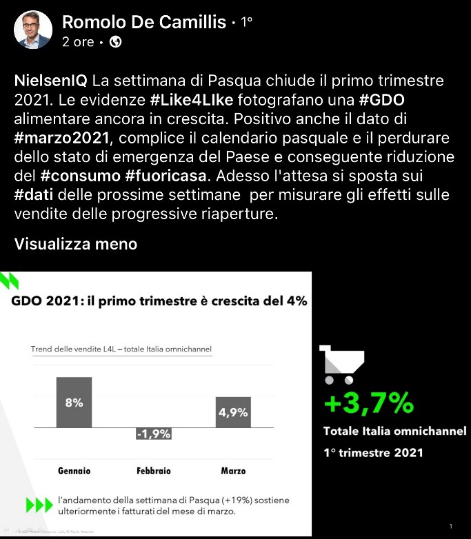 Il dato (+3,7%) tiene conto anche dell’e-commerce e dei discount, che stanno crescendo, già da tempo, più di superstore, supermercati, piccole superfici etc.