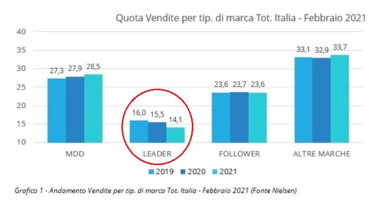 In questo contesto, dove si pensava che le grandi marche leader (come Barilla, Ferrero, Nestlè, Coca-Cola etc) rassicurassero e crescessero più del mercato, in Italia, stanno invece perdendo quota.