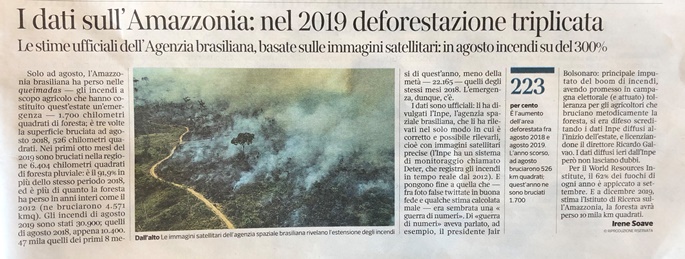il Corriere della Sera il 10 Settembre 2019 fa presente che gli incendi in Amazzonia continuano e aggiunge :