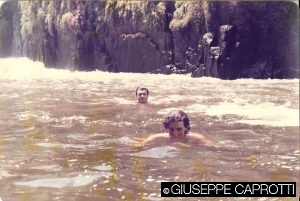 Sotto: Giuseppe Caprotti con Francesco De Marchi nel Rio Jarì, affluente del Rio delle Amazzoni, nel 1979, dopo aver lavorato un’estate da Carrefour Brasil.